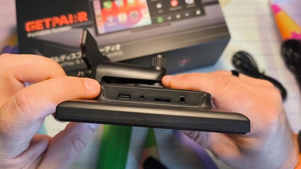 El disseny del GetPairr ScreenFlow és senzill i minimalista, però modern. Presenta una pantalla amb bisells prims i una forma allargada horitzontalment, cosa que el converteix en un ajust perfecte per a qualsevol cotxe, independentment d'on es col·loqui. A l'interior, trobem l'entrada d'alimentació Type-C, una ranura micro SD, una entrada AUX i un port AV-IN per connectar una càmera de visió posterior. El botó d'engegada/apagada es troba a la part superior, mentre que l'altaveu del sistema, una de les quatre opcions de sortida d'àudio del sistema, es troba a la part posterior.